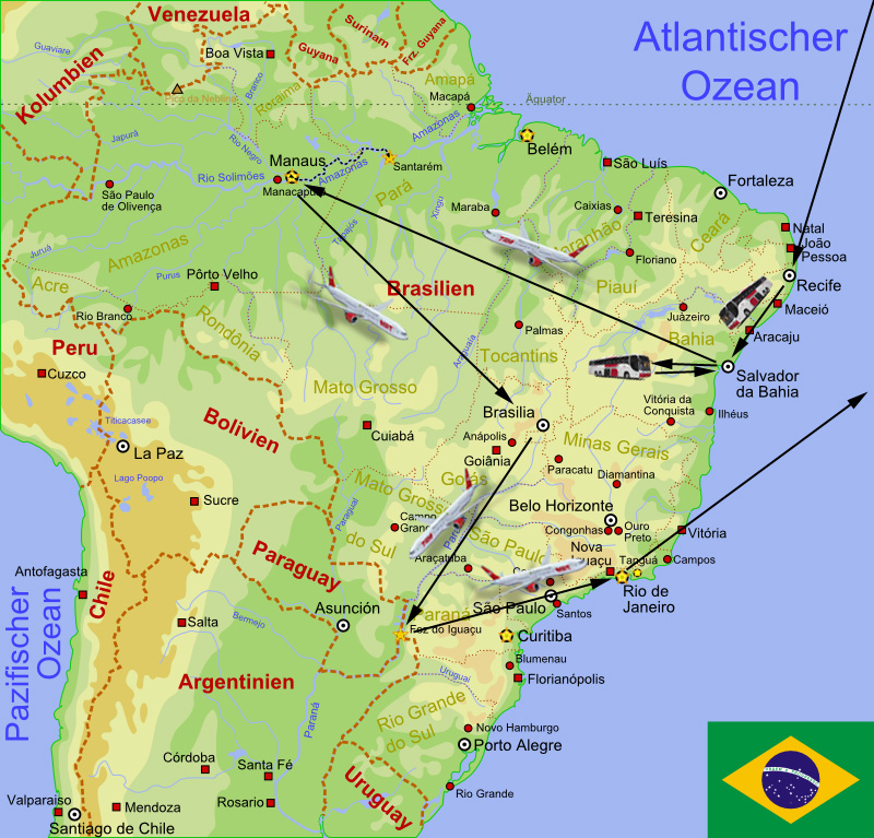 desde el 13 de octubre hasta el 4 de noviembre del año 2007 haremos nuestro primer viaje a Brasil. Este ha sido la razón de realizar esta pagina web. Aqui encontrareís una pequeña descripción del viaje y un mapa de Brasil, el mapa ya se realizäo, la descripciäon seguirá pronto. Asi os podeís hacer una idea de nuestra ruta y los diferentes destinos, más detalles podreís encontrar, lo más actual posible, en nuestro diario de viajes.